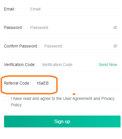 As you can see in the example above, there is a verification code section besides the referral code. After typing your mail or phone number above, click on "send now" opposite the Verification Code. Write the code received on your phone or e-mail in the verification code section, that's it. "I have read and agree to the User Agreement and Privacy Policy." Confirm option. After filling all the form and typing 16aEB in the referral section, don't forget to click sign up to complete your referral registration process. good luck.